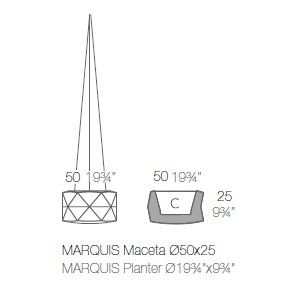 Conçu pour l'intérieur et l'extérieurStructure en résine de polyéthylène rotomouléRésistant aux intempéries, UV et températures extrêmes- 100% recyclable-Dimensions : Ø50 x 26cm - Intérieur: Ø38cm x H22cm - Capacité: 3L- Poids : 4.5kg- 14 coloris disponibles : blanc, noir, bronze, acier, gris anthracite, vert anis, prune, beige, ecru, taupe, vert kaki, bleu marine, rouge, orange- Existe également en version laquée (sur demande) - Câblage et platine de fixation au plafond inclus, voir dessin technique dans gallerie photo (seuls le matériel de fixation de la platine au plafond n'est pas inclus, à adapter selon les cas)Articles complémentaires de la même collection :- Pot Marquis- Tapis MarquisLe Pot Suspendu Marquis de chez Vondom est une rencontre entre nature et sculpture contemporaine. Imaginé par le designer Jose Manuel Ferrero, ce pot au look géométrique recevra plantes et fleurs pour apporter une touche très nature à vos espaces. Ce pot 100% recyclable est d'une qualité inégalable grâce à sa matière en polyéthylène rotomoulé qui lui confère une haute résistance aux intempéries, aux UV et aux températures extrêmes. Décliné en 14 coloris tendances, le Pot Suspendu Marquis donnera une touche contemporaine aussi bien à vos espaces intérieurs qu'extérieurs, tout en restant discret. Suspendu aux quatre coins d'une terrasse, il assurera une décoration tendance.
