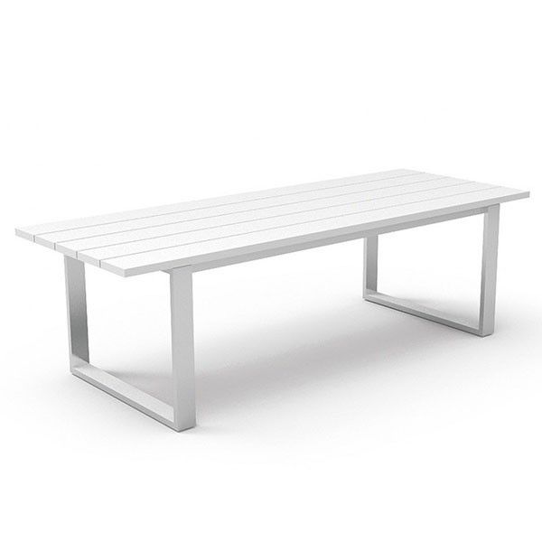 Table de repas conçue pour un usage extérieur Structure en aluminium ou inox Plateau en aluminium, teck ou verre opaque trempéRésistance aux températures extrêmes, UV et intempériesDimensions : L220m x larg 92cm x H75cm Coloris : - Structure Aluminium Blanc – Plateau Blanc (poids: 74KG)- Structure Aluminium Blanc – Plateau Teck antique (poids: 40KG)- Structure Inox – Plateau Verre opaque trempé sérigraphié couleur tourterelle (poids: 124KG)Housse de protection vendue séparément